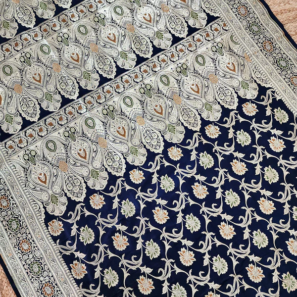 - Technique - A versatile Kadwa weave and fine Meenakari technique. The detailed and arduous Kadua technique involves hand-weaving each motif separately. It takes months on the handloom, but to make a more robust pattern, which stands out on the fabric, it is a task involving the painstaking additions of supplementary coloured resham threads during the hand-weaving process.