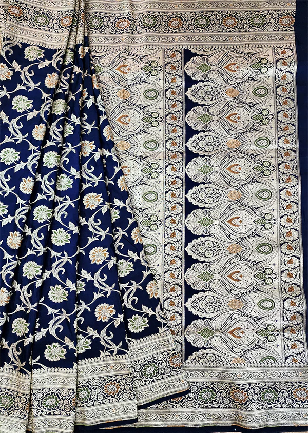 - Pièce de résistance - A rich blooming jangla pattern in stunning kadwa meenakari brought to life by beautiful Banarasi artistry, makes this saree a distinctive and lasting piece of handloom art. Each line of weaving requires 80 hand movements.