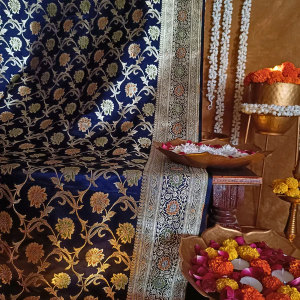 Stroll through our exquisite yard with vines of flowers strewn, with enthralling border and pallu, featuring flora utopia, in gold zari with breathtaking meenakari accents. A traditional, time-honoured silken art of Eternal Kashi.